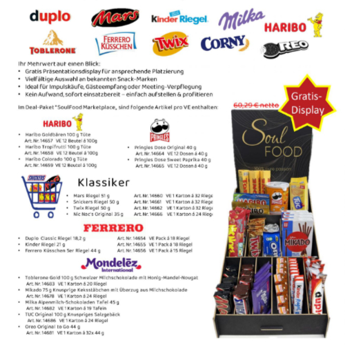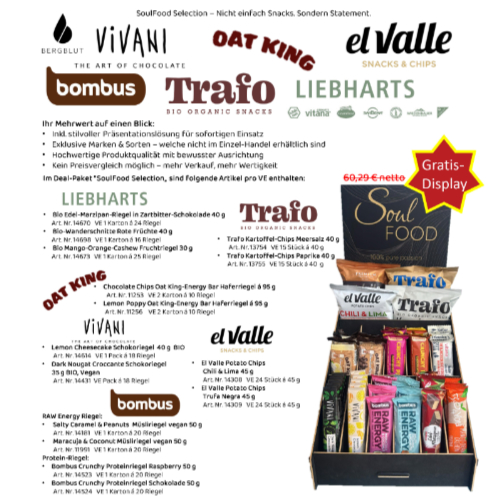 Entdecken Sie das SoulFood Starter-Paket: Eine kuratierte Auswahl hochwertiger Riegel, Chips und Schokoladen – nur bei uns erhältlich. Keine Massenware, keine Vergleichspreise – dafür unverwechselbarer Geschmack, starke Optik und Produkte mit Premium-Charakter. Ideal für Rezeption, Kassenbereich, Lounge oder Konferenzraum – überall dort, wo Genuss auffällt und Eindruck hinterlässt. Ihre Vorteile: Inkl. stilvoller Präsentationslösung für sofortigen Einsatz Exklusive Marken & Sorten – nicht im Handel erhältlich Hochwertige Produktqualität mit bewusster Ausrichtung Kein Preisvergleich möglich – mehr Verkauf, mehr Wertigkeit SoulFood – Nicht einfach Snacks. Sondern Statement.
