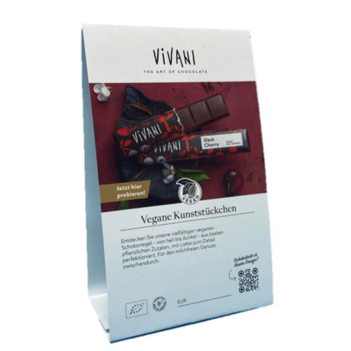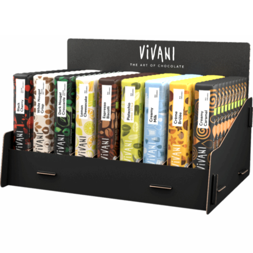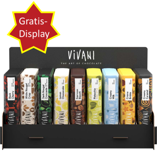 BIO Schokolade im Riegel-Format und verpackt in plastikfreier Folie und Papier Bio Vivani Schokoriegel jetzt mit Gratis Display für Ihren POS! Setzen Sie mit Vivani auf hochwertige Bio Schokoladenriegel, die Genuss und Nachhaltigkeit vereinen. Präsentieren Sie Ihr Sortiment ab sofort noch wirkungsvoller: Mit dem attraktiven Gratis Display erhalten Ihre Kunden sofort den perfekten Überblick und die Kaufentscheidung fällt leicht.