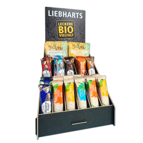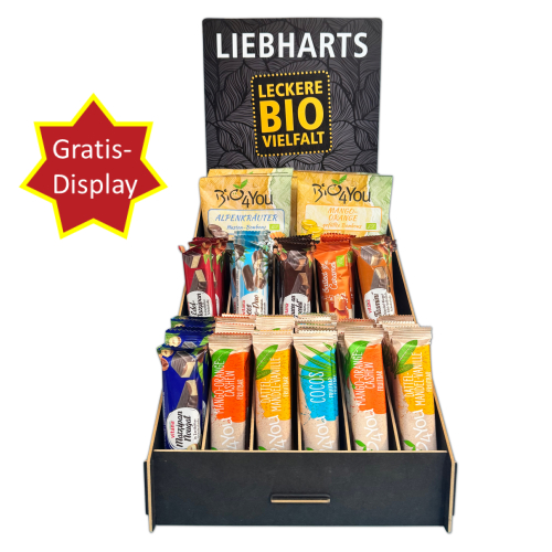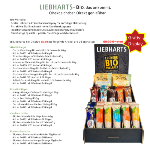 Entdecken Sie das Liebharts Starterpaket mit einer sorgfältig zusammengestellten Auswahl an hochwertigen Bio-Marken aus dem Hause Liebharts: feine Schokolade, fruchtige Riegel und wohltuende Bonbons – alles in bewährter Bio-Qualität. Inklusive: eine kostenlose, stilvolle Präsentationseinheit für den direkten Einsatz am Empfang, im Kassenbereich oder Konferenzraum. Liebharts – Bio, das ankommt. Direkt sichtbar. Direkt genießbar. Ihre Vorteile: Gratis Liebharts-Präsentationsdisplay für sofortige Platzierung Attraktive Bio-Snacks mit hoher Kundenakzeptanz Ideal für Gesundheitsbewusste, Gästeempfang & Impulskäufe. Nachhaltige Qualität – positiv fürs Image und die Umwelt.