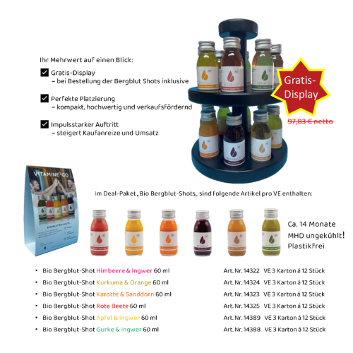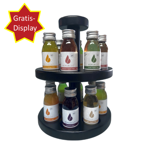 Mit dem hochwertigen Präsentationsdisplay bringen Sie die Bio Bergblut Shots direkt ins Blickfeld Ihrer Kunden.